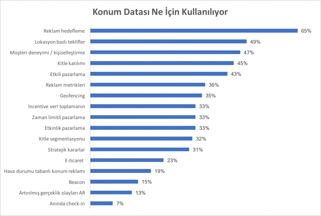 Tahmin edileceği üzere “Lokasyon Bazlı Reklam” teknolojilerinin kullanım amaçlarından birincisi Ad-Targeting olarak göze çarpıyor. Kişiselleştirme ve Gelişmiş Kullanıcı Deneyimi ise hemen onu takip eden sebepler arasında. Kullanıcı etkileşimi de diğer önemli bir neden.
